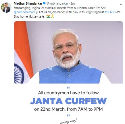 Filmmaker Madhur Bhandarkar shared PM's address to the nation on coronavirus on Twitter. He wrote, "Encouraging, logical & practical speech from our Honourable PM Shri @narendramodi Ji. Let us all join hands with him in this fight against #COVID-19. Stay home, & stay safe."