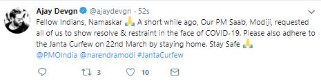 Ajay Devgn further shared the message on Twitter and wrote, "Fellow Indians, Namaskar A short while ago, Our PM Saab, Modiji, requested all of us to show resolve & restraint in the face of COVID-19. Please also adhere to the Janta Curfew on 22nd March by staying home. Stay Safe @PMOIndia @narendramodi #JantaCurfew."