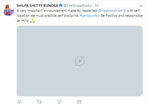 Shilpa Shetty advocated the PM's idea of 'Janata Curfew' in a Twitter post. Her tweet reads, "A very important announcement made by respected @narendramodi ji with self-isolation we must practice self-discipline. #jantacurfew Be Positive and responsible Jai Hind."