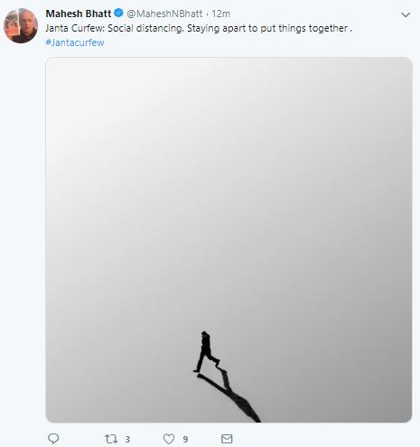 Mahesh Bhatt took to Twitter and shared the message of 'Janata Curfew' as he shared the picture of a man walking down a vacant space. He captioned the post as, "Janta Curfew: Social distancing. Staying apart to put things together. #Jantacurfew."
