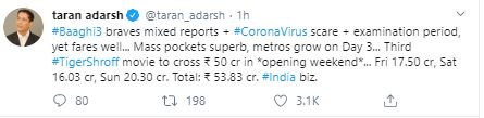 Film critic and movie trade analyst Taran Adarsh shared the figures on Twitter and noted that the movie braved mixed records due to Coronavirus scare, examination period, yet the movie fared well at the weekend. 'Baaghi 3' also marks as a landmark in Tiger's career as it is the third movie to cross Rs 50 crore mark on the opening weekend.