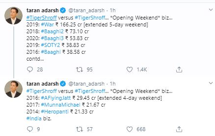 Taran also shared an account of the films by the 30-year-old actor since his first 2014 flick 'Heropanti'. Tiger's 2019 action-drama 'War' topped the chart as it grossed whopping 166.25 crores due to an extended weekend of 5 days, followed by the second part of the Baaghi franchise that collected Rs 73.10 crores on the opening weekend. The third place is taken over by 'Baaghi 3' with the collection of Rs 53.83 crores. His 2014 flick 'Heropanti' stood last at the chart with a collection of Rs 21.33 crores.