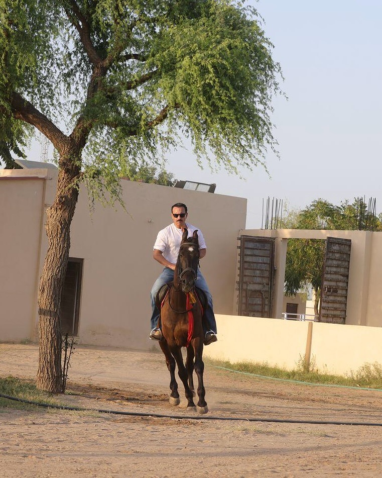 In her post, Kareena first shared a picture of herself sitting on a sofa in a formal outfit. The next two pictures featured Saif, who was seen riding a horse in a white kurta, blue jeans, and black sunglasses.