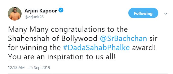 Arjun Kapoor also wished the 'Shahenshah' of Bollywood for winning the prestigious award.