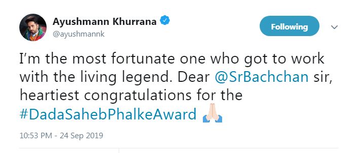 "I'm the most fortunate one who got to work with the living legend. Dear @SrBachchan sir, heartiest congratulations for the #DadaSahebPhalkeAward," he tweeted.