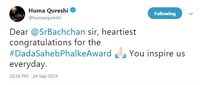 Saying that Amitabh inspires us every day, Huma Qureshi tweeted, "Dear @SrBachchan sir, heartiest congratulations for the #DadaSahebPhalkeAward. You inspire us everyday."