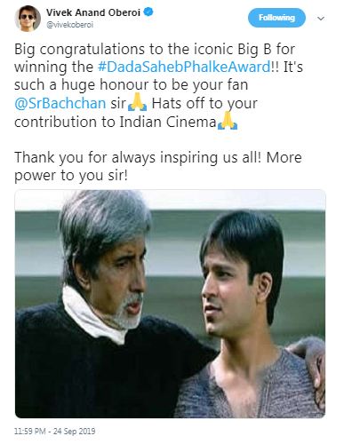 "Many Many congratulations to the Shahenshah of Bollywood @SrBachchan sir for winning the #DadaSahabPhalke award! You are an inspiration to us all!" he tweeted.