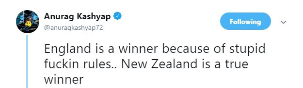 "England is a winner because of stupid fuckin rules. New Zealand is a true winner," he tweeted.