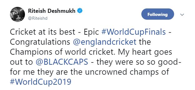 Riteish Deshmukh congratulated the England cricket team for their win but called the Black Caps "the uncrowned champs."