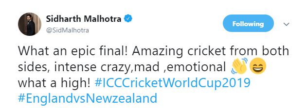 "What an epic final! Amazing cricket from both sides, intense crazy, mad, emotional what a high! #ICCCricketWorldCup2019 #EnglandvsNewzealand," he wrote.