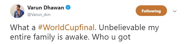 Varun Dhawan, who is a cricket buff, wrote, "What a #WorldCupfinal. Unbelievable my entire family is awake. Who u got."