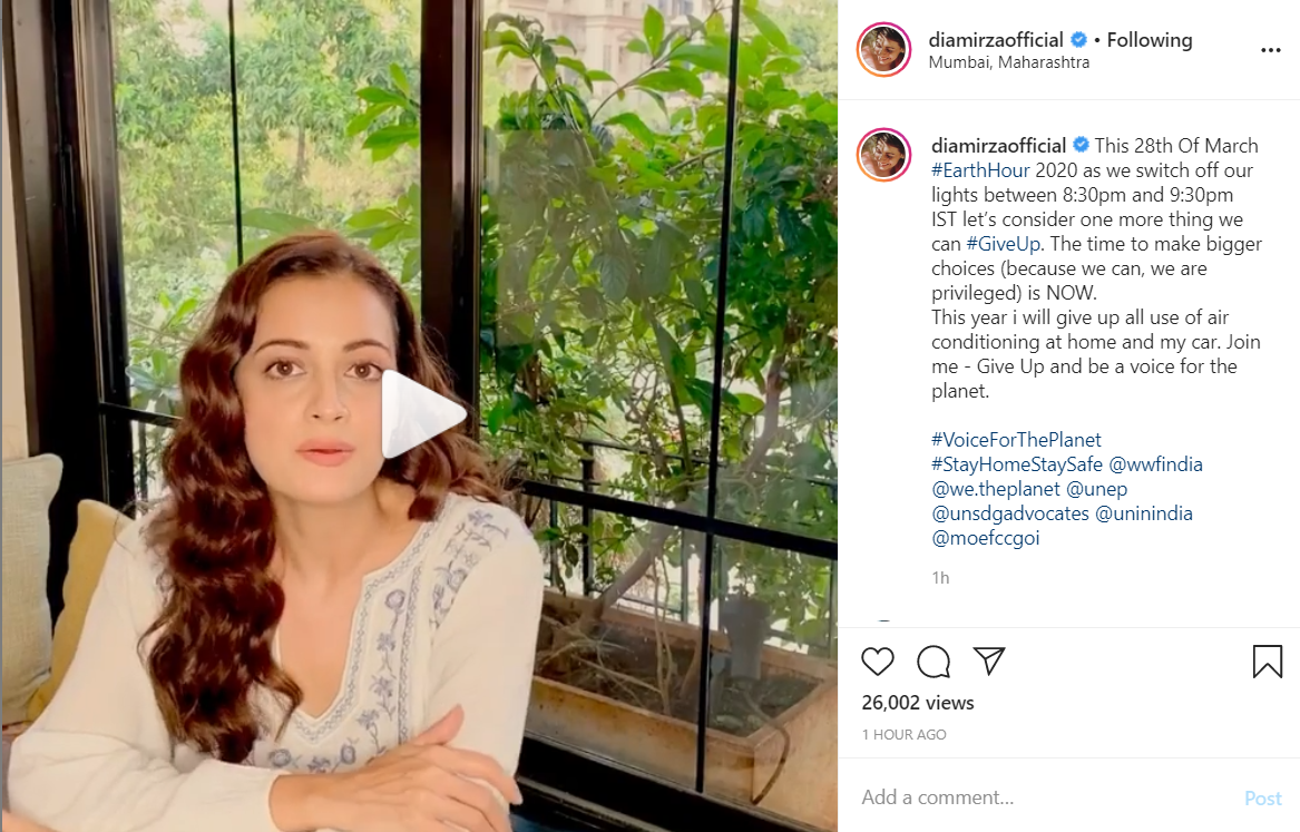"This 28th Of March #EarthHour 2020 as we switch off our lights between 8:30 pm and 9:30 pm IST let's consider one more thing we can #GiveUp. The time to make bigger choices (because we can, we are privileged) is NOW," read the caption.