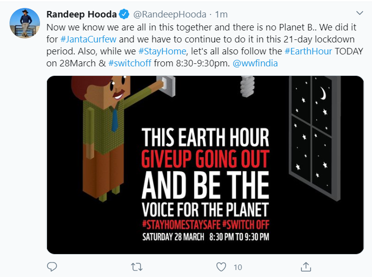 "Now we know we are all in this together and there is no Planet B.. We did it for #JantaCurfew and we have to continue to do it in this 21-day lockdown period. Also, while we #StayHome, let's all also follow the #EarthHour TODAY on 28March & #switchoff from 8:30-9:30pm. @wwfindia," he tweeted.