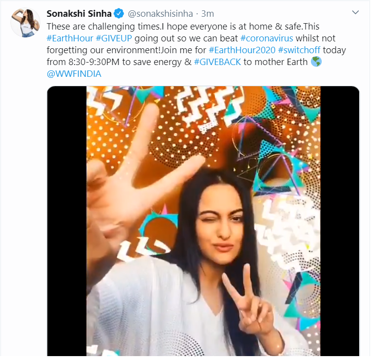 These are challenging times. I hope everyone is at home & safe. This #EarthHour #GIVEUP going out so we can beat #coronavirus whilst not forgetting our environment! Join me for #EarthHour2020 #switchoff today from 8:30-9:30 PM to save energy & #GIVEBACK to mother Earth@WWFINDIA," she said in a tweet.