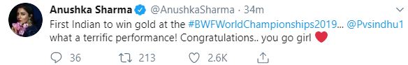 Calling her win a terrific performance, Anushka Sharma wrote: "First Indian to win gold at the #BWFWorldChampionships2019...