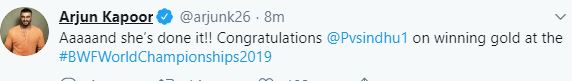 Arjun Kapoor also congratulated Sindhu and wrote, "Aaaaand she's done it!! Congratulations @Pvsindhu1 on winning gold at the #BWFWorldChampionships2019."