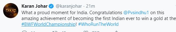 Ace filmmaker Karan Johar congratulated Sindhu on her win.