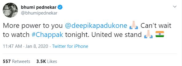 While Qureshi called Deepika a "Rockstar", Pednekar in her tweet said, "More power to you @deepikapadukone Can't wait to watch #Chappak tonight. United we stand."