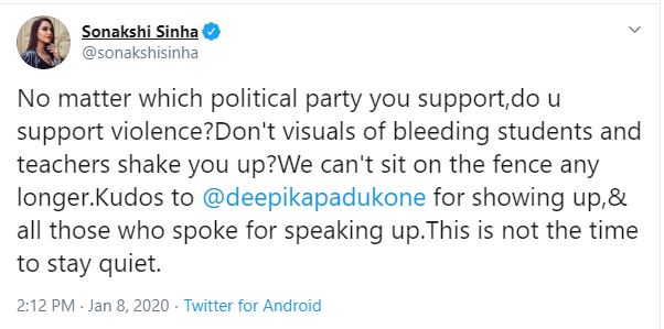 "No matter which political party you support, do u support violence? Don't visuals of bleeding students and teachers shake you up? We can't sit on the fence any longer. Kudos to @deepikapadukone for showing up, & all those who spoke for speaking up. This is not the time to stay quiet," read Sinha's tweet.