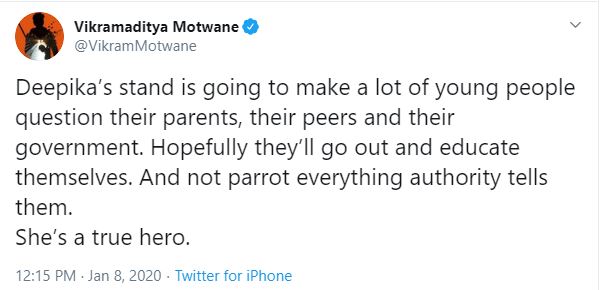 "Deepika's stand is going to make a lot of young people question their parents, their peers and their government. Hopefully, they'll go out and educate themselves. And not parrot everything authority tells them. She's a true hero," Motwane's tweet read.