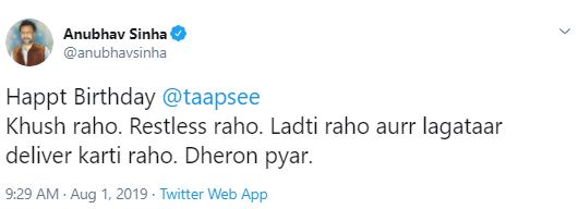 Director Anubhav Sinha tweeted, "Happt Birthday taapsee. Khush raho. Restless raho. Ladti raho aurr lagataar deliver karti raho. Dheron pyar."