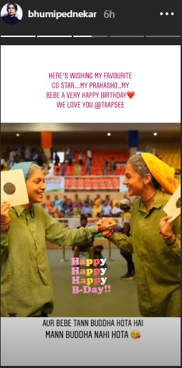 Bhumi Pednekar who will be seen sharing screen space with Taapsee in upcoming 'Saand Ki Aankh' wrote, "Here's wishing my favourite co-star..my prakasho..my bebe a very happy birthday. We love you Taapsee."