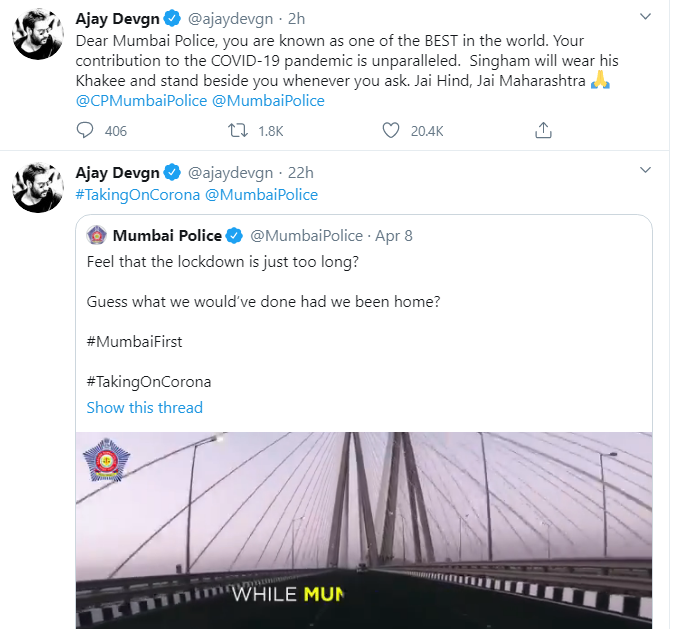 "Dear Mumbai Police, you are known as one of the BEST in the world. Your contribution to the COVID-19 pandemic is unparalleled," Ajay Devgn tweeted.