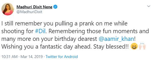 Jokingly accused him of playing a prank on her while shooting for ‘Dil,’ B-town’s ‘Dhak Dhak’ took to her Twitter handle and wrote. “I still remember you pulling a prank on me while shooting for #Dil. Remembering those fun moments and many more on your birthday dearest Aamir Khan! Wishing you a fantastic day ahead. Stay blessed!”