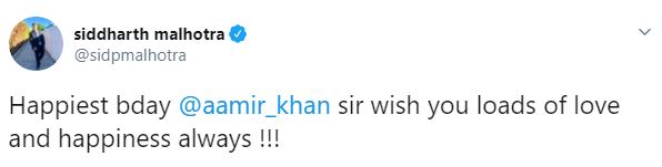 “Happiest bday Aamir Khan sir wish you loads of love and happiness always!” wrote Siddharth Malhotra.