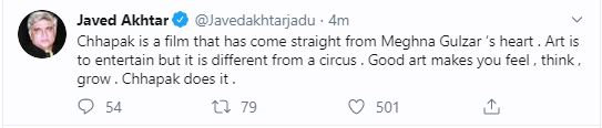 Addressing the director of the film Meghna Gulzar, the Indian poet shared a post on Twitter, writing: "Chhapaak is a film that has come straight from Meghna Gulzar's heart."