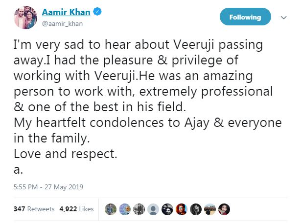 Aamir Khan who was privileged enough to work with Veeru Devgan wrote on Twitter: " I'm very sad to hear about Veeruji passing away. I had the pleasure & privilege of working with Veeruji. He was an amazing person to work with, extremely professional & one of the best in his field. My heartfelt condolences to Ajay & everyone in the family. Love and respect."