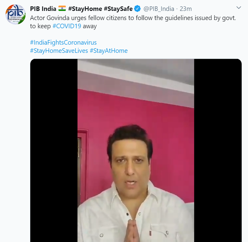 In a 23-seconds long video shared by Press Information Bureau (PIB) on its official twitter handle, the actor is seen urging his followers to stay at home as instructed by the Prime Minister Narendra Modi in a bid to combat the spread of the coronavirus.