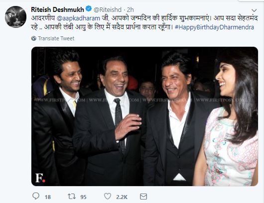 Ritesh Deshmukh also wished the veteran actor. In the picture shared on Twitter, he is seen along with Dharmendra, Shah Rukh Khan and his wife Genelia D'Souza. Ritesh captioned the picture as, Respected @aapkadharam ji, a very happy birthday to you. May you always be healthy. I will always pray for your long life."