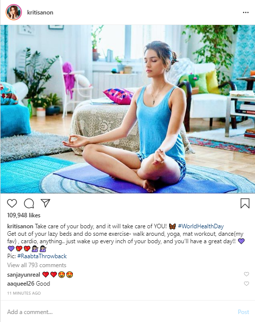 "Take care of your body, and it will take care of YOU! #WorldHealthDay," Kriti captioned the post.