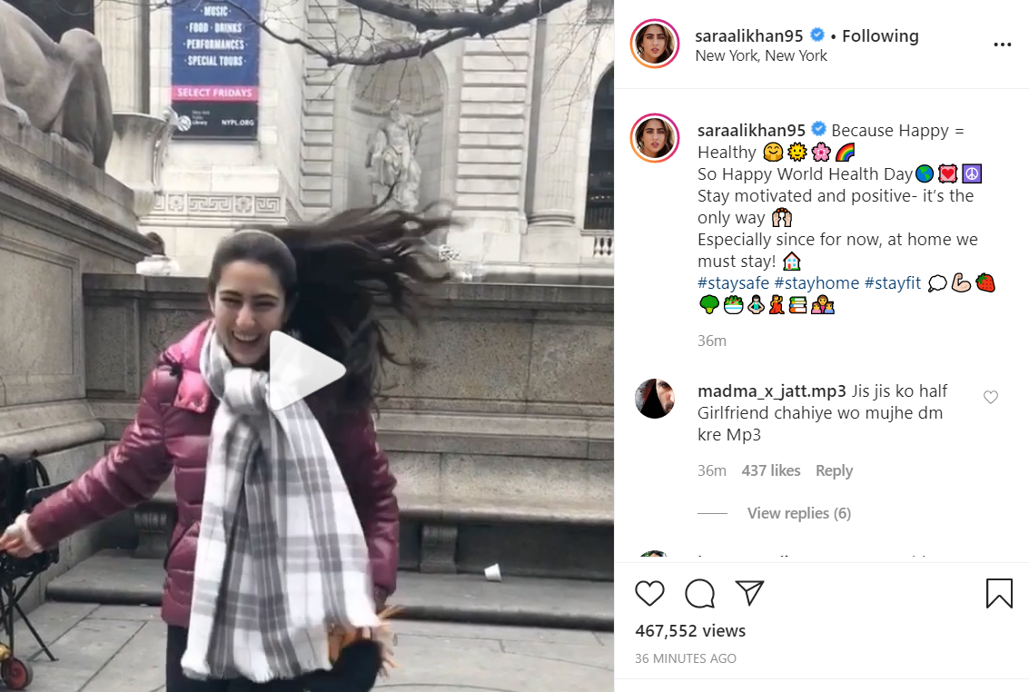 Posting an adorable careless jump-around video of hers on Instagram, the actor wrote: "Because Happy = Healthy ... So Happy World Health Day"