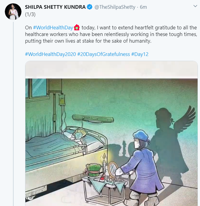 Lastly, the fitness guru of Bollywood Shilpa Shetty took World Health Day as an opportunity to extend her "heartfelt gratitude to all the healthcare workers who have been relentlessly working in these tough times, putting their own lives at stake for the sake of humanity."
