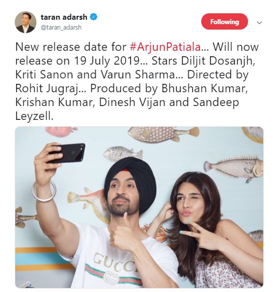 “New release date for #ArjunPatiala... Will now release on 19 July 2019... Stars Diljit Dosanjh, Kriti Sanon and Varun Sharma... Directed by Rohit Jugraj... Produced by Bhushan Kumar, Krishan Kumar, Dinesh Vijan and Sandeep Leyzell,” Indian film critic and trade analyst Taran Adarsh tweeted.