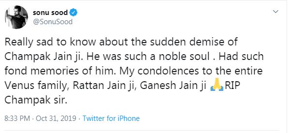 "Really sad to know about the sudden demise of Champak Jain Ji. He was such a noble soul. Had such fond memories of him. My condolences to the entire Venus family, Rattan Jain Ji, Ganesh Jain ji RIP Champak sir," tweeted the actor.