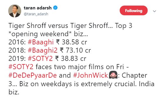 "Tiger Shroff versus Tiger Shroff... Top 3 *opening weekend* biz... 2016: Baaghi Rs 38.58 cr 2018: Baaghi2 Rs 73.10 cr 2019: SOTY2 Rs 38.83 cr SOTY2 faces two major films on Fri - DeDePyaarDe and JohnWick: Chapter 3... Biz on weekdays is extremely crucial. India biz," he wrote.
