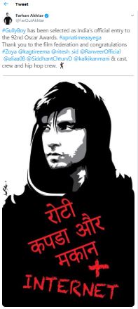 The news was announced on Twitter by film's producer Farhan Akhtar. He wrote, "Gully Boy has been selected as India's official entry to the 92nd Oscar Awards."