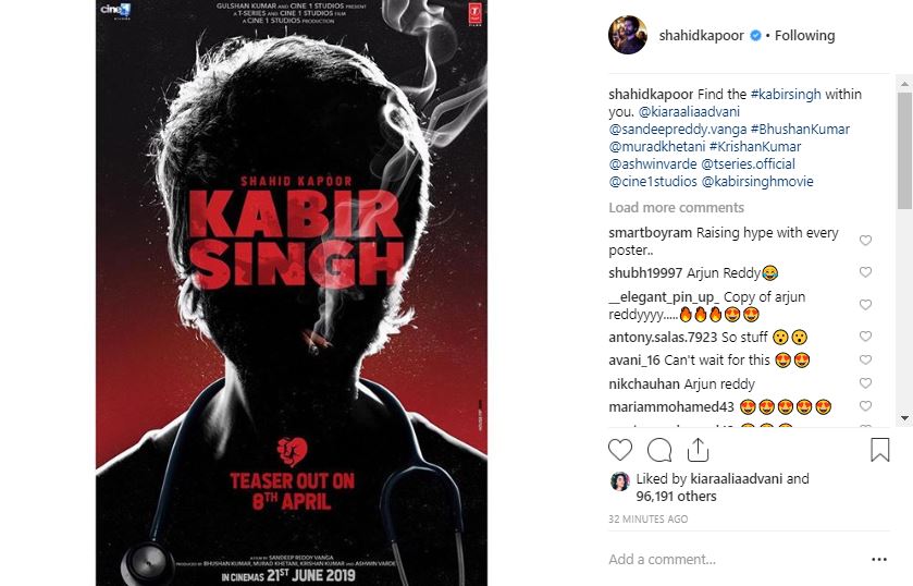 He captioned the image, “Find the #kabirsingh within you. @kiaraaliaadvani @sandeepreddy.vanga #BhushanKumar @muradkhetani #KrishanKumar @ashwinvarde @tseries.official @cine1studios @kabirsinghmovie.”