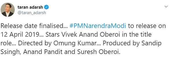 He wrote, “Release date finalised... #PMNarendraModi to release on 12 April 2019... Stars Vivek Anand Oberoi in the title role... Directed by Omung Kumar... Produced by Sandip Ssingh, Anand Pandit and Suresh Oberoi.”
