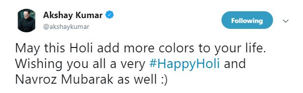 Akshay Kumar too extended wishes to his fans, writing, “May this Holi add more colors to your life. Wishing you all a very #HappyHoli and Navroz Mubarak as well.”