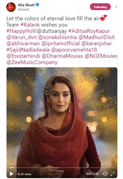 Alia Bhatt wished her fans on behalf of the team of ‘Kalank.’ She posted a small clip featuring all the characters from the upcoming film and wrote, “Let the colors of eternal love fill the air Team #Kalank wishes you #HappyHoli.”