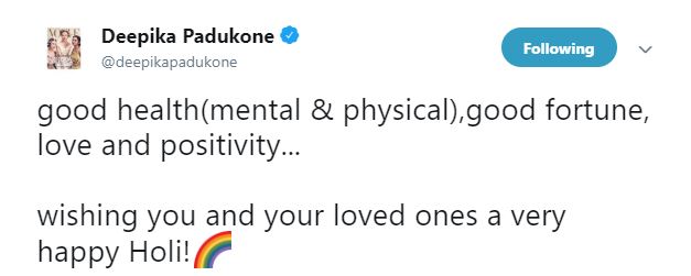 Deepika Padukone, on the occasion of Holi, wished her fans good health and good fortune. She wrote, “good health (mental & physical), good fortune, love and positivity... wishing you and your loved ones a very happy Holi.”