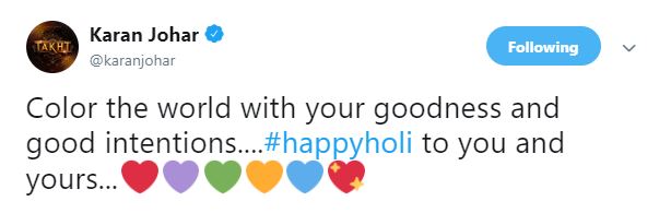 Karan Johar too extended his good wishes, writing, “Color the world with your goodness and good intentions....#happyholi to you and yours....”