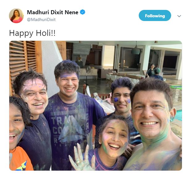 Madhuri Dixit posted a happy family picture and wrote along with the adorable picture, “Happy Holi!!”