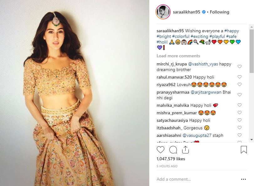Sara Ali Khan took to her Instagram account to post a stunning picture of herself along with a Holi wish for her fans.