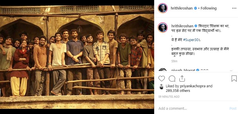 While sharing the picture on social media, the 'Bang Bang' actor revealed about his learning from the film. "The character was of a teacher, but on this set, I was a student. This is my #Super30. I learned a lot from his penance, temperament and enthusiasm," he wrote.