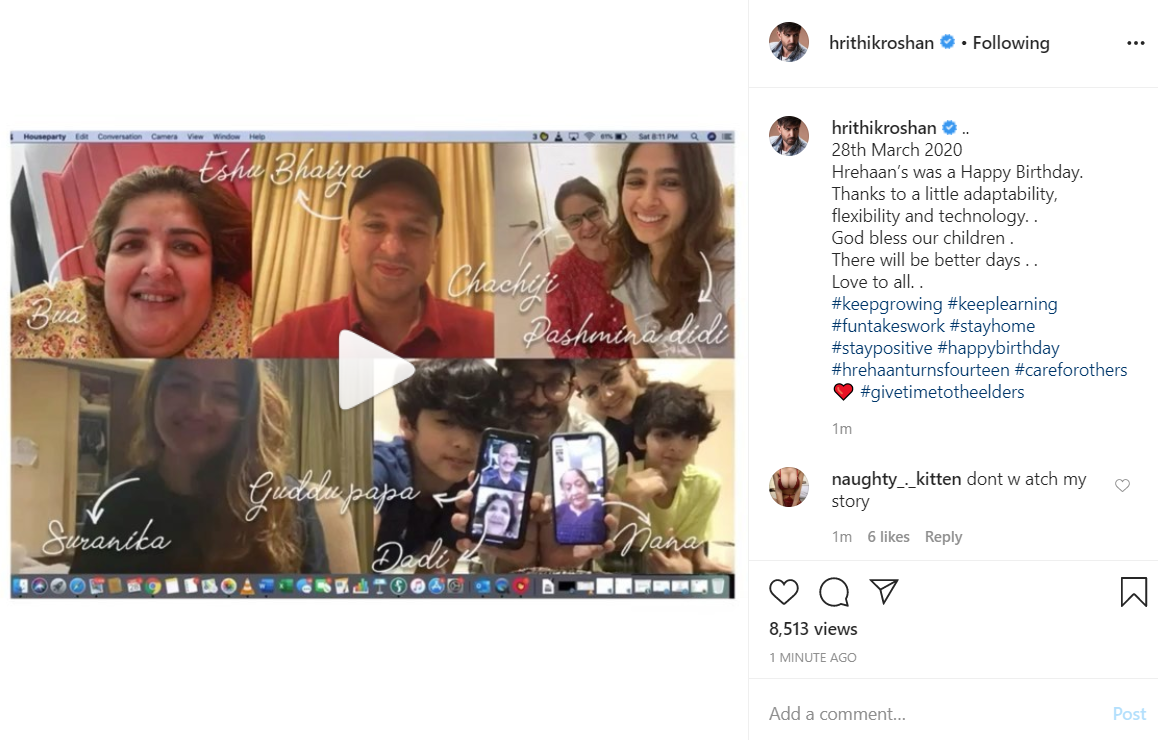 "28th March 2020. Hrehaan's was a Happy Birthday. Thanks to a little adaptability, flexibility and technology. God bless our children . There will be better days. .Love to all. And thank you @suranikashealthykitchen for the amazing cake," reads the caption.